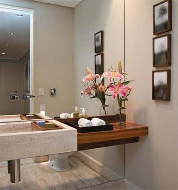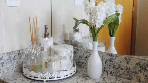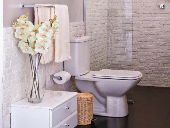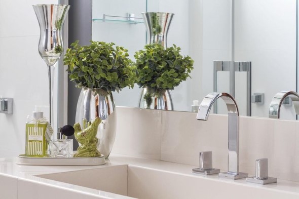 Outra opção é o uso de pequenos vasinhos de flores, que também contribuem para um visual charmoso no banheiro, e podem ser mudados de lugar de tempos em tempos.