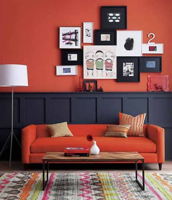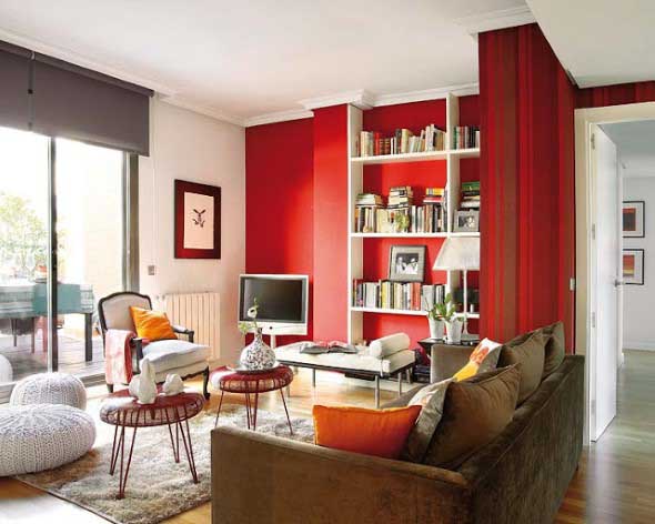 A primeira opção para usar a cor vermelha na decoração é começar pela pintura das paredes, que pode ser feita em todo o ambiente, ou apenas em uma parte específica, o que gera um belo contraste na decoração.