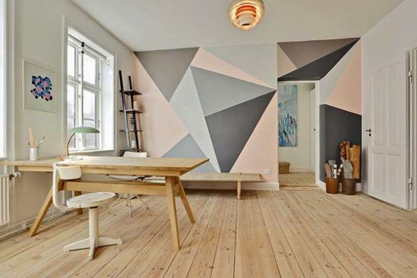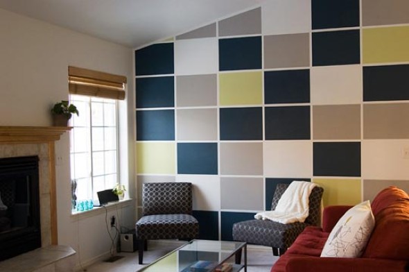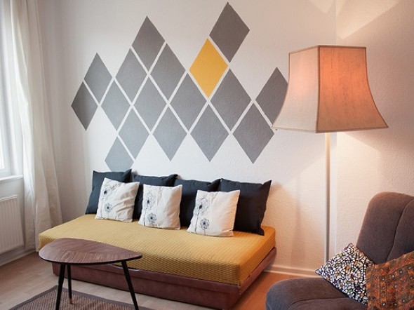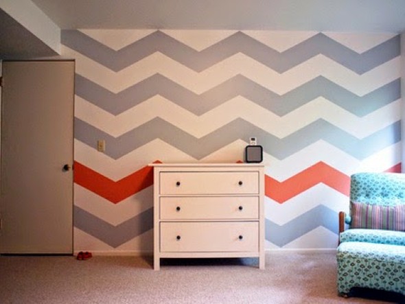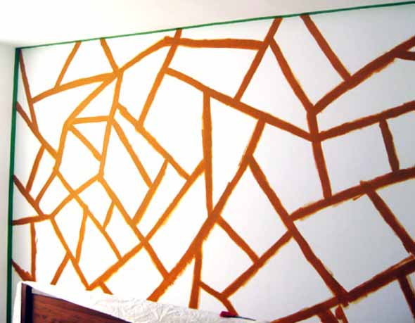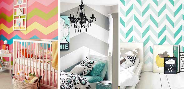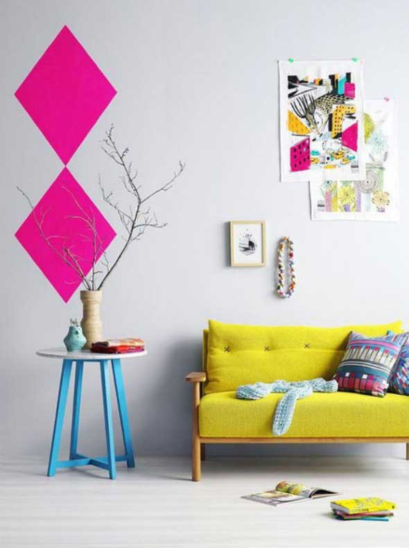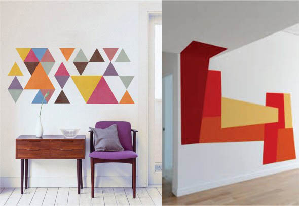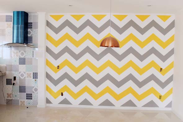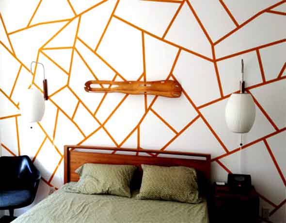 Vocês também podem criar estampas geométricas com o uso da fita adesiva, que serve para demarcar o local aonde serão pintadas novas cores nas paredes, e podem ser feitas por cima de pinturas já existentes.