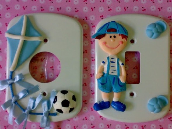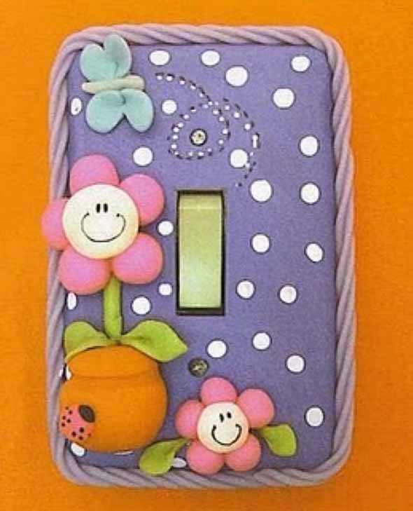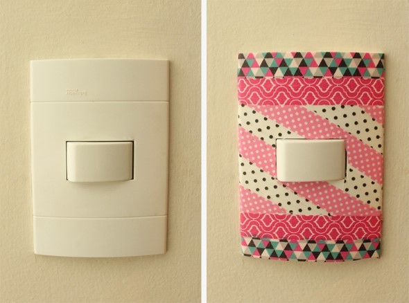 Depois, para customizar o espelho de tomada vocês podem utilizar papel contact, em diversas estampas e cores; massinha de biscuit; pintura artesanal, fita adesiva, dentre outras técnicas manuais.