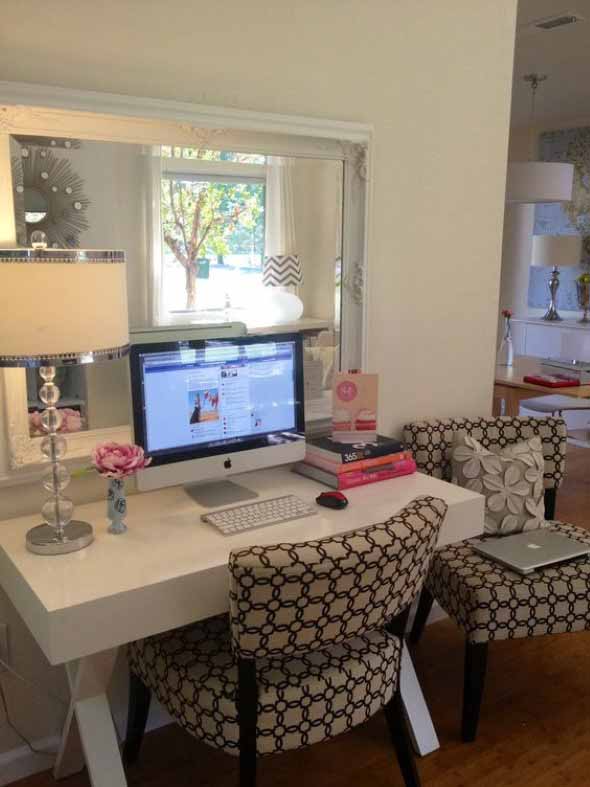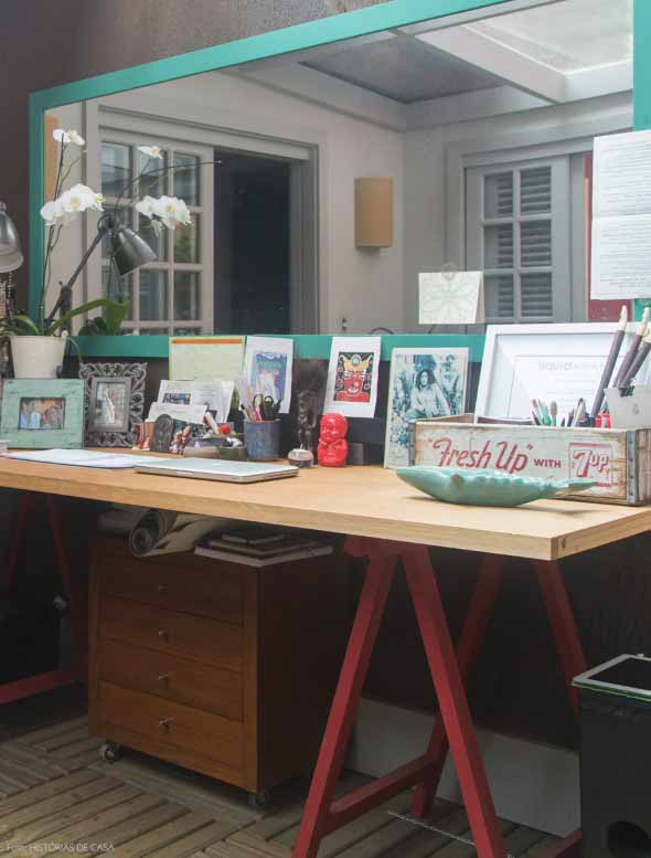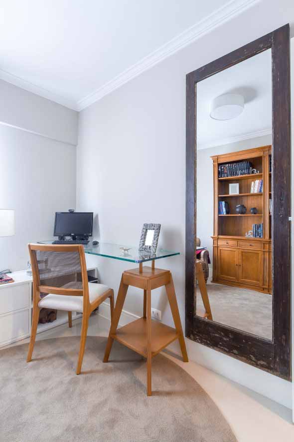 Também é possível deixar o espelho ao lado do Home Office, de forma que ele oferece mais amplitude visual, principalmente em cômodos pequenos pela casa.