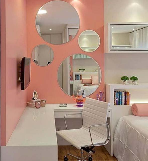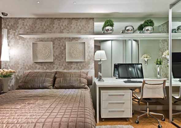 Outra opção é o uso de armários com porta espelhada, que podem ficar no quarto das crianças ou do casal, e com isso vai servir como ótimo plano de fundo para uma área de estudos ou trabalho bem convidativa.