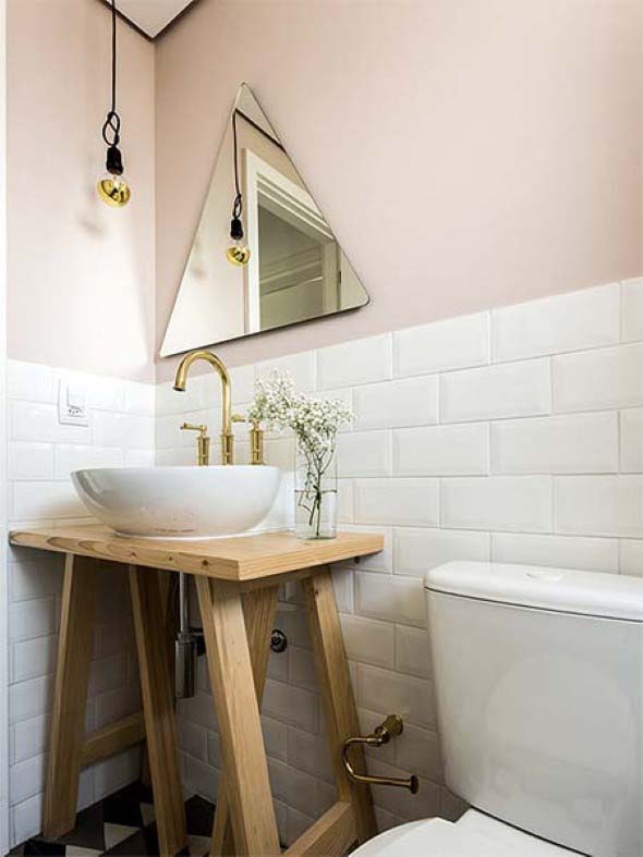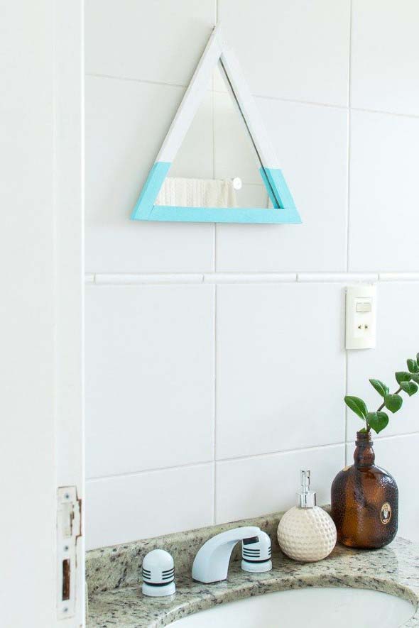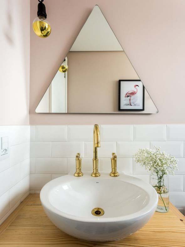 Também é possível trocar o espelho do banheiro por um modelo triangular, que vai deixar o ambiente com um estilo retro muito popular atualmente.