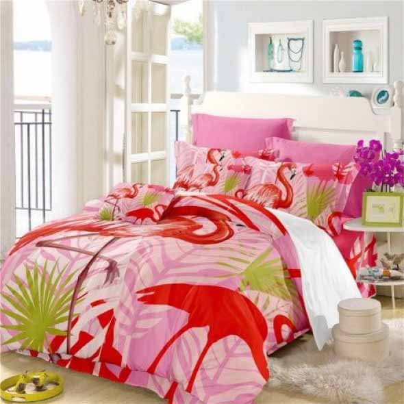 Os flamingos também estão presentes em roupas de cama, toalhas, capas de almofadas, e inúmeras peças simples de incorporar na decoração.
