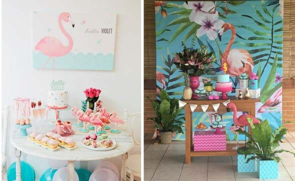Até as festas se tornam mais charmosas com uma decoração inspirada nas imagens dos flamingos.