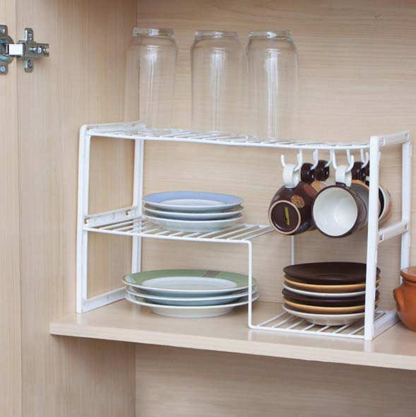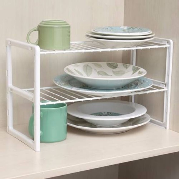Também é possível utilizar um rack multiuso, que é feito em PVC, e pode ser colocado em cada cantinho do armário da cozinha ou do quarto, e vai permitir uma organização bem rápida aí na sua casa.