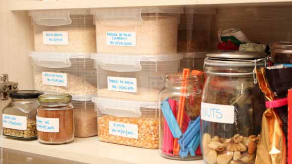 Na cozinha o reaproveitamento de potes para guardar mantimentos é uma opção bem viável e prática, e que vai oferecer resultados muito rápidos na organização.