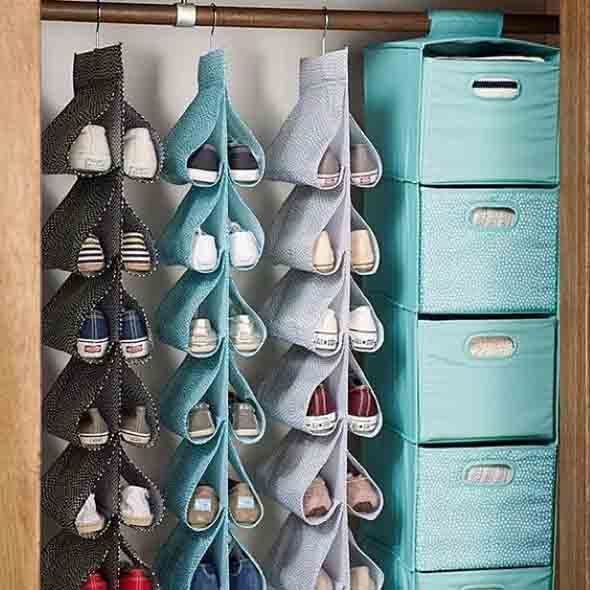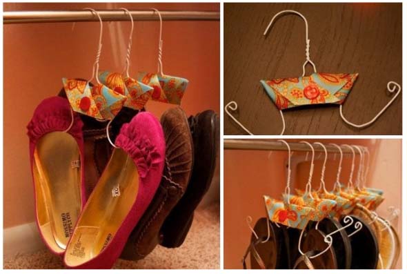 Já para quem tem pouco espaço, pode optar por usar cabides de roupas, que ajudam a deixar os sapatos pendurados no guarda-roupas, com um gasto bem reduzido.