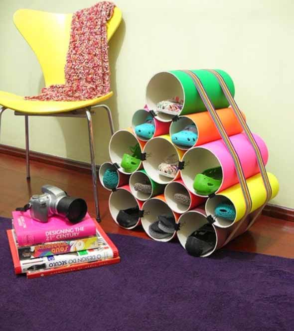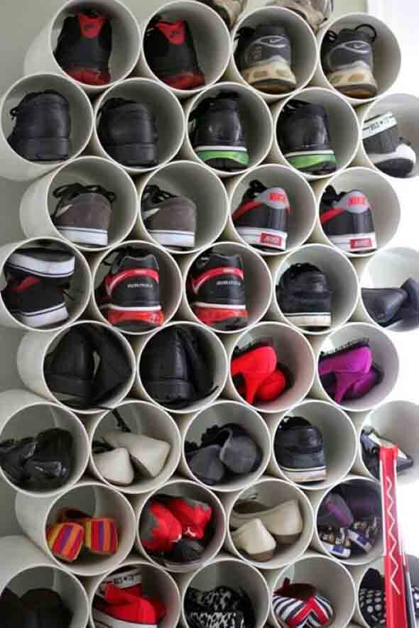 Uma das ideias que mais tem feito sucesso para guardar sapatos em casa é o uso de canos de PVC, que oferecem um bom espaço para deixar os sapatos bem organizados, e pode ser montado de forma bem simples.