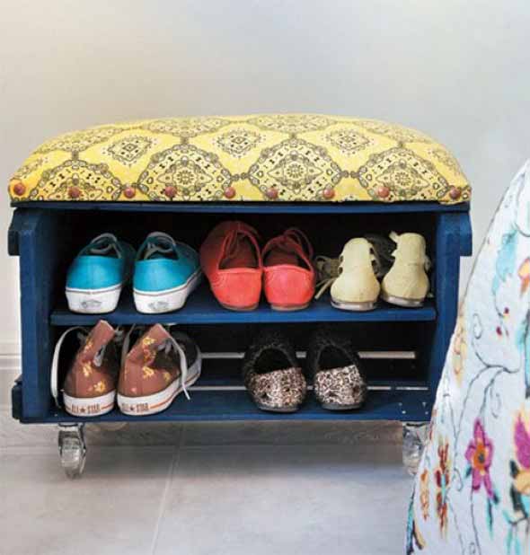 O uso de caixotes de feira e paletes, também é muito bem vindo na hora de guardar e organizar sapatos, de uma forma prática, e que pode ser colocada em diversos ambientes, como o quarto e o hall de entrada.