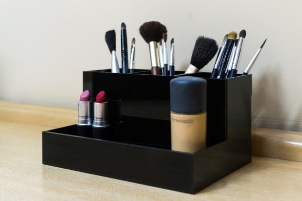 Nessa hora os pincéis de maquiagem podem ser organizados em diversos recipientes, como os modelos em acrílico, que possuem espaços adequados para pincéis, batons, blushes, dentre outros itens.