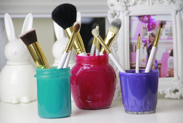 Aqui vale uma dica bem bacana, que é o uso de grãos, bolinhas de isopor, miçangas, etc., dentro dos potes, para que cada pincel possa ser fixado no interior, sem ficar encostando um no outro.