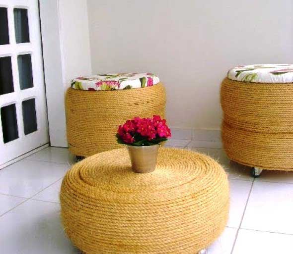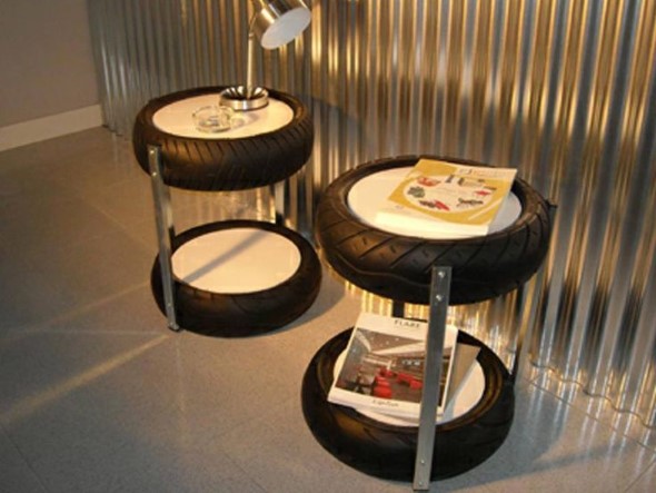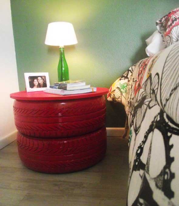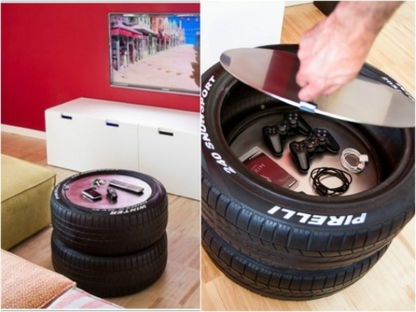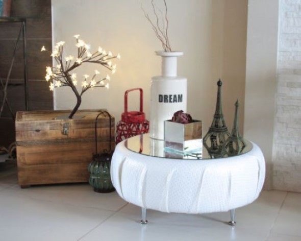 Uma das ideias muito usadas hoje em dia é a montagem de mesinhas de pneus, que podem ser usadas na sala ou no quarto, e vai permitir a colocação de objetos decorativos, ou para guardar itens em seu interior.