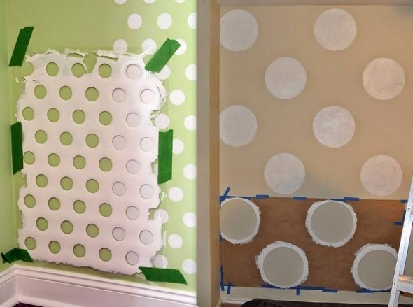 As bolinhas também podem ser pintadas com o uso de moldes variados, que devem ser bem fixados nas paredes, e retirados após a tinta secar bem.