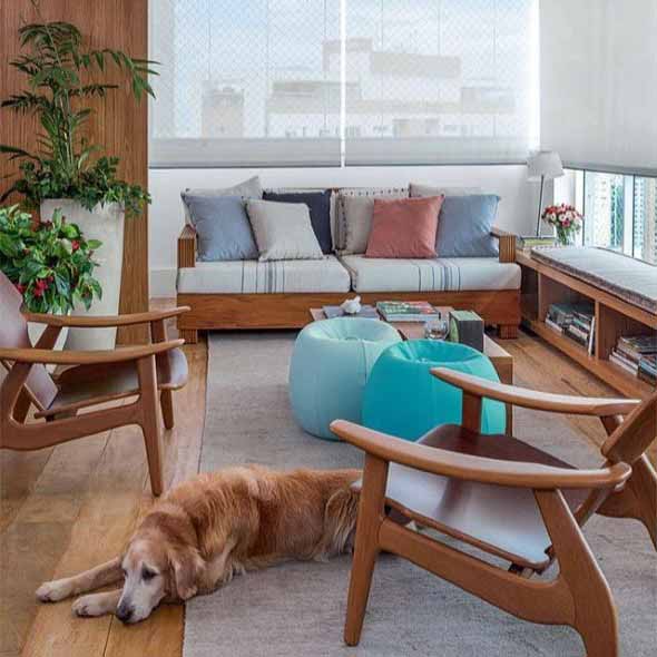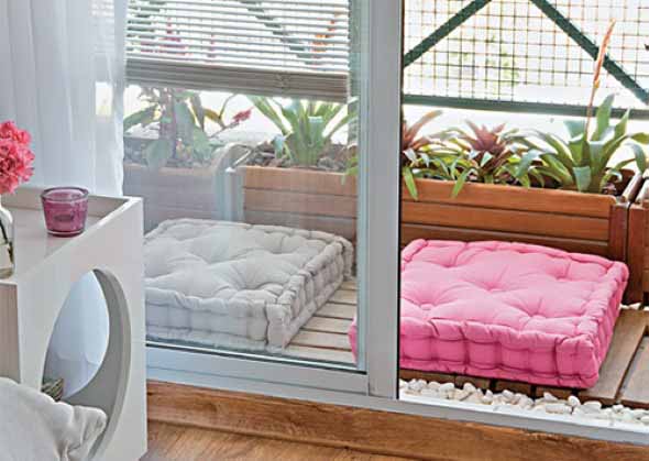 O uso de almofadas e pufes gigantes é outra opção de conforto, que permite a todos ficarem espalhados pela varanda, de maneira bem confortável e aconchegante.