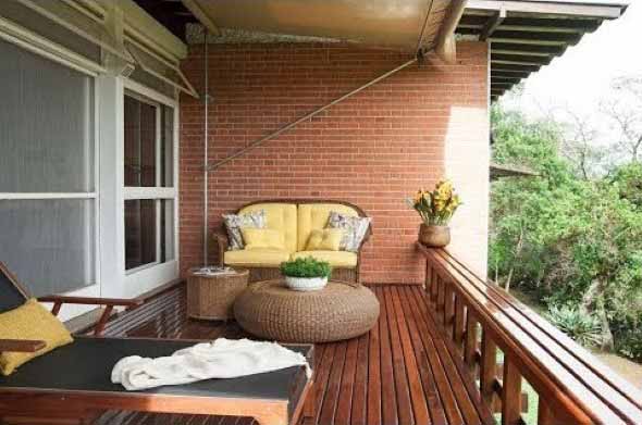 O piso da varanda pode ser revestido com decks de madeira, que garante mais conforto aos pés, aliado as flores e plantas, que geram aquela sensação de vida e muito aconchego.
