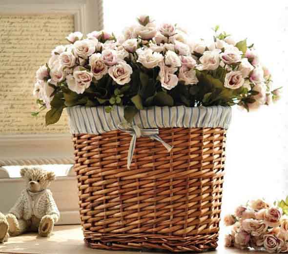 E talvez o mais charmoso com o uso dos cestos na decoração seja transformá-los em vasos de flores, que são ideias para ambientes internos ou áreas externas da casa, como a varanda ou o jardim.