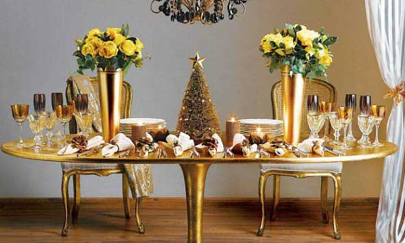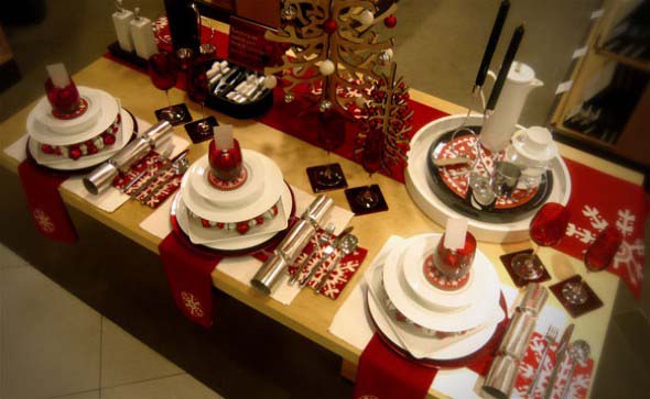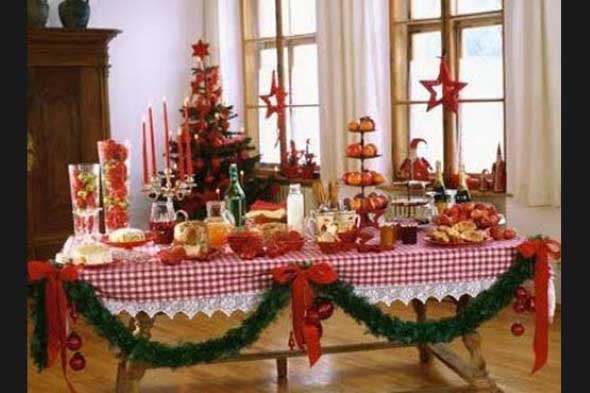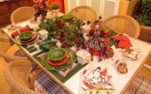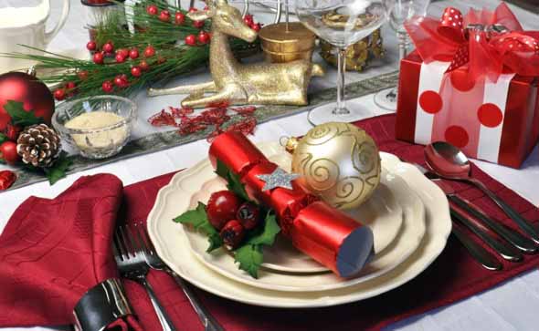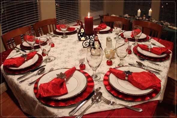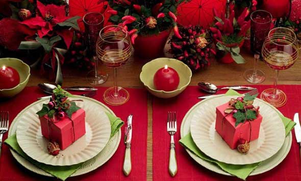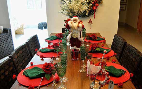 As cores da toalha, guardanapos e enfeites para esta ocasião são o vermelho, o verde, o dourado e o prateado, que refletem o espírito natalino de uma forma mais charmosa.