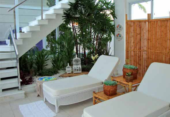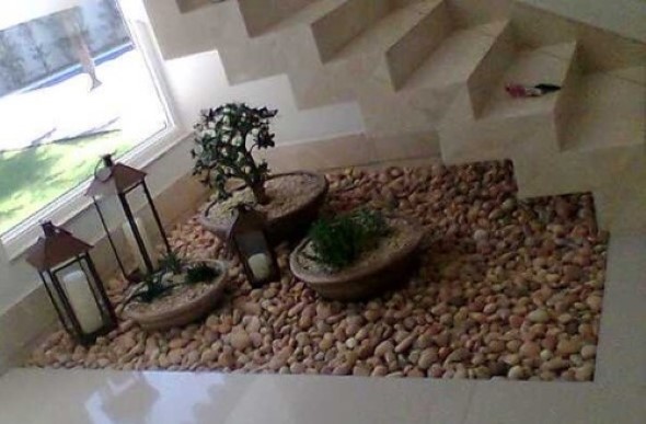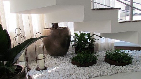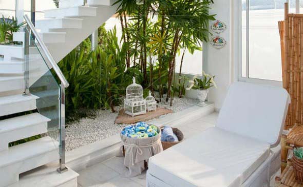 Um bom exemplo é a montagem do jardim no vão da escada, um espaço que muitas vezes fica ocioso no imóvel, e que pode ser aproveitado desta maneira bem charmosa.