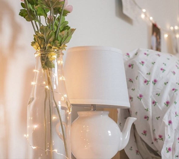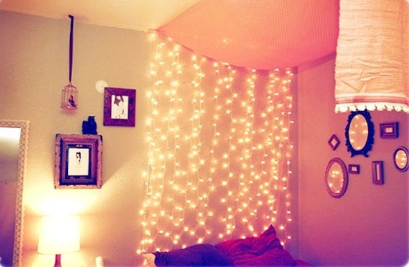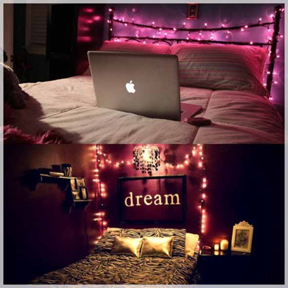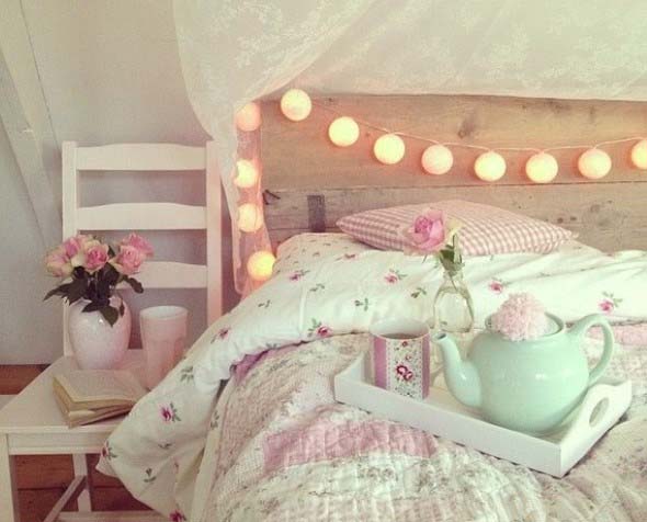 Um dos lugares aonde as luzinhas pisca-pisca são mais utilizados na decoração é o quarto, que ganha desenhos diversificados, que produzem uma iluminação charmosa e elegante no local.