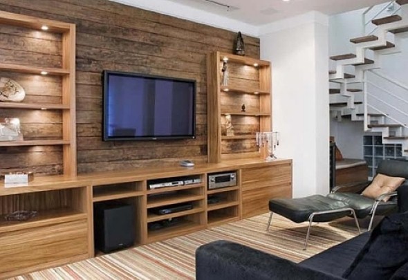 E um bom uso para madeira de demolição é a criação do painel para colocação do televisor de LED na sala de estar, em conjunto com o rack ou nichos decorativos.