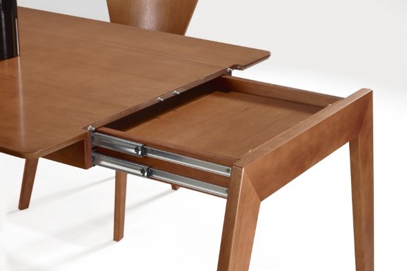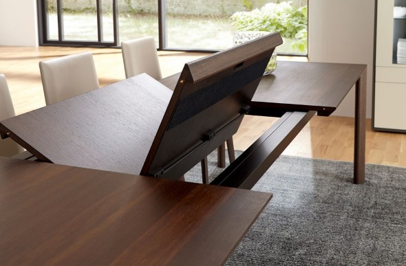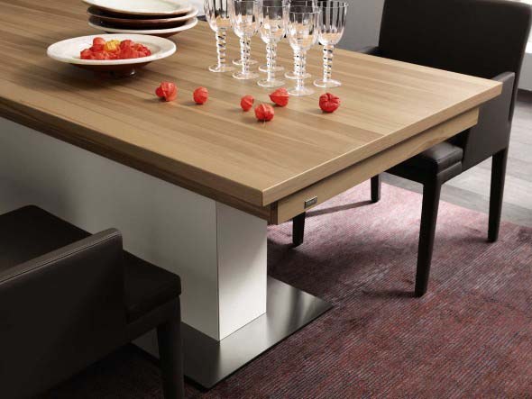 Esta mesa é projetada para que seu tamanho possa ser ampliado, com apenas alguns movimentos, que incluem desdobrar as laterais, e em alguns casos complementar o vão com peças extras (que ficam dentro da mesa).