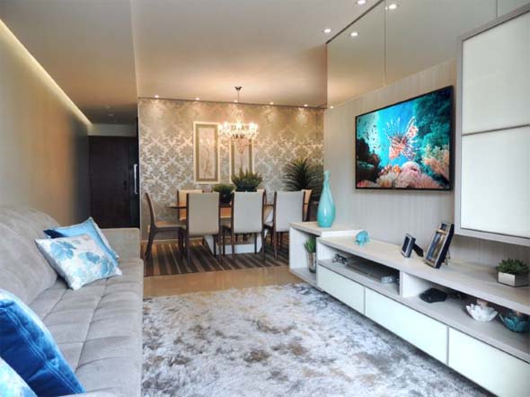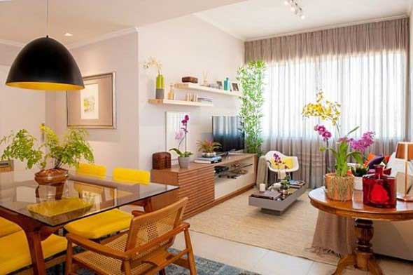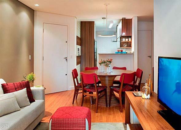 Com isso, em uma decoração de integração entre os ambientes, a mesa de jantar pode ficar bem ao lado do sofá da sala, economizando espaço, de maneira simples e funcional.