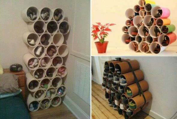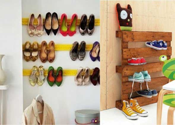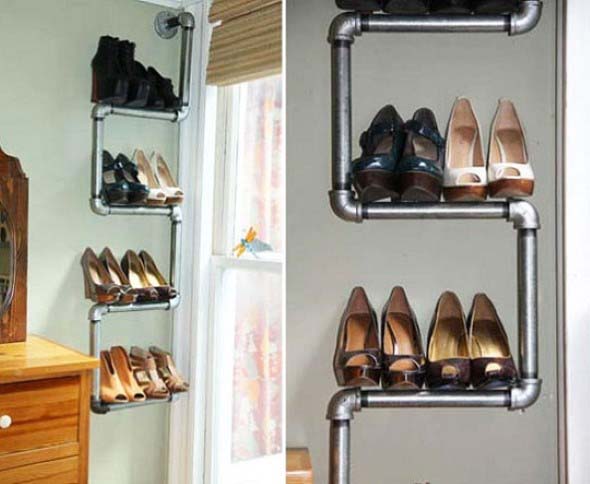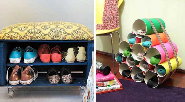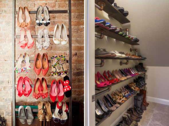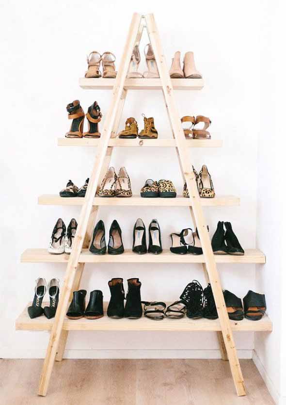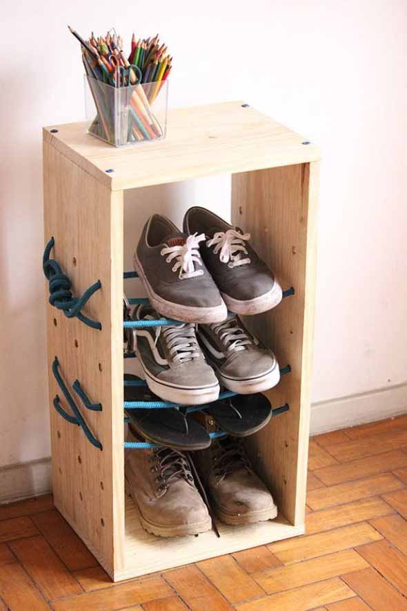 Também é possível montar uma sapateira em casa, com o uso de diversos materiais, como canos de PVC, caixotes de feira ou madeiras de demolição.