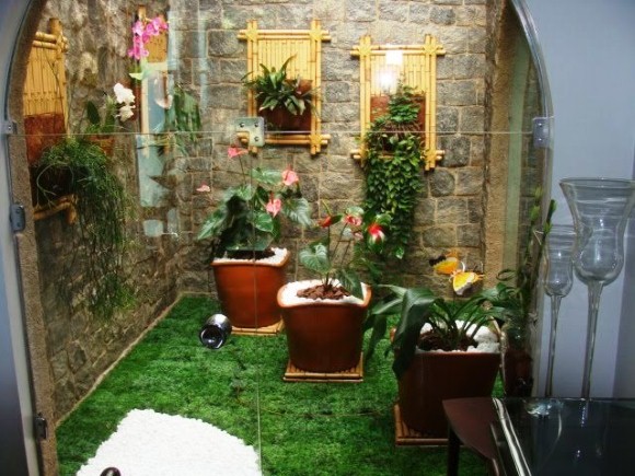 Para montagem do jardim podem ser escolhidas plantas de diferentes tamanhos e modelos, que devem ser plantadas dentro de vasos fechados, para evitar acumulo de umidade nos pisos de sua casa.