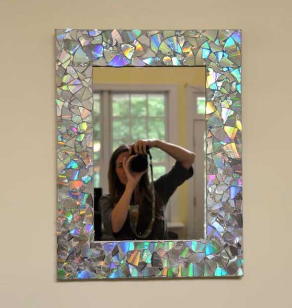 Com recortes de CDs dá para decorar quadros, molduras, porta retratos e espelhos, com um mosaico charmoso e bem criativo.