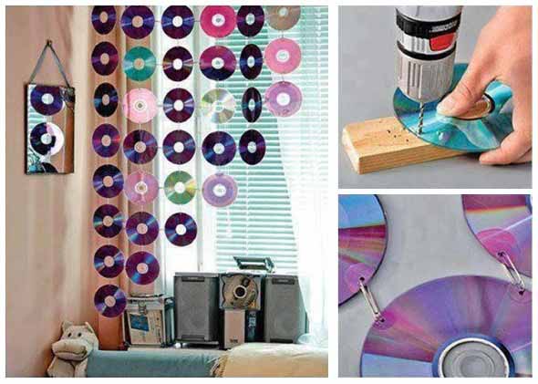 Uma das formas é a montagem de cortinas, que podem ser feitas com CDs entrelaçados entre si, e ajudam na decoração de diversos ambientes.