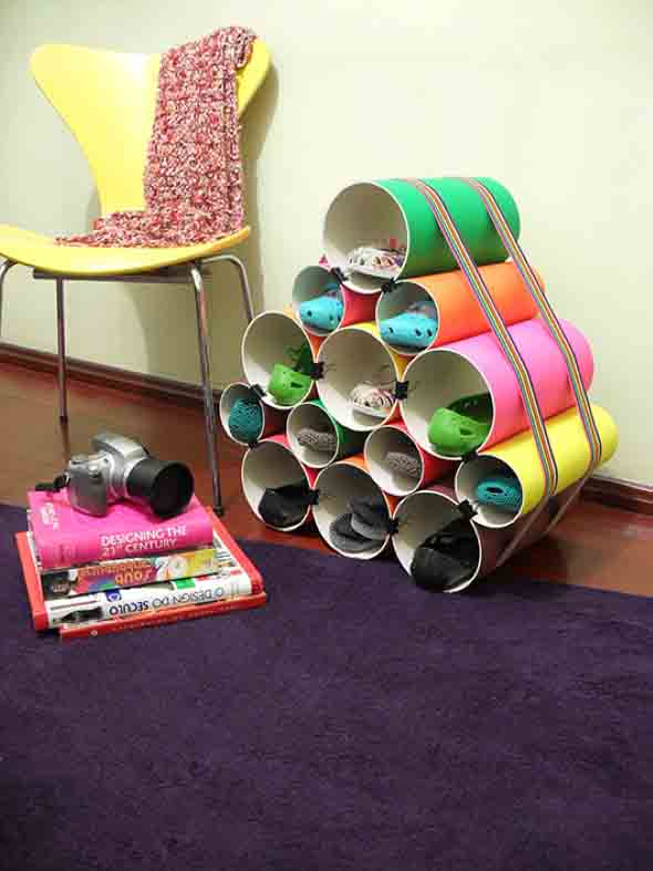 E uma dica bem prática para fazer em casa é uma sapateira artesanal, que pode ser montada com canos de PVC agrupados, e fixada com o uso de cordas, cinta elástica, cola quente, dentre outros materiais.