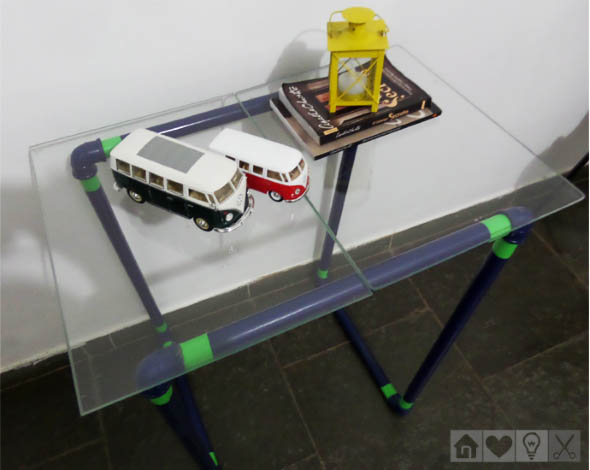 No vídeo ela encaixa os canos sem o uso da cola, mas aí na sua casa você podem usar lixar a ponta dos canos, com uma lixa fina, e em seguida usar a cola nas junções entre os canos (cola específica para colar canos de PVC), que vai garantir maior fixação na mesinha.