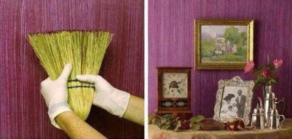 Um dos mais simples, e que trás resultados bem criativos é a vassoura, que todos têm em casa, e que pode lhes auxiliar para fazer uma pintura diferenciada nas paredes.
