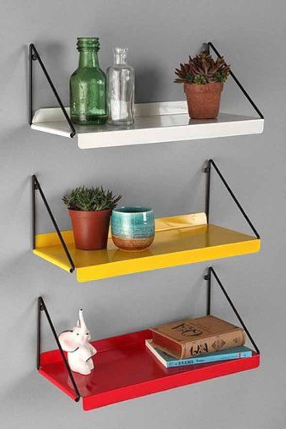 E uma dica bem legal para deixar a decoração com prateleiras mais charmosa é optar pelo uso de prateleiras coloridas, que vão se tornar o destaque de cada ambiente.