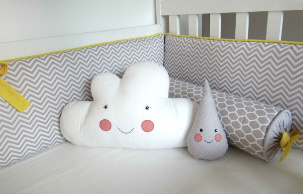 As nuvens também podem ser feitas em tecido, em formatos bem variados, como pelúcias, móbiles de pendurar acima do berço, e muito mais.
