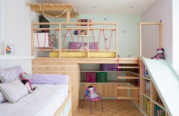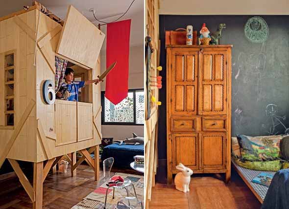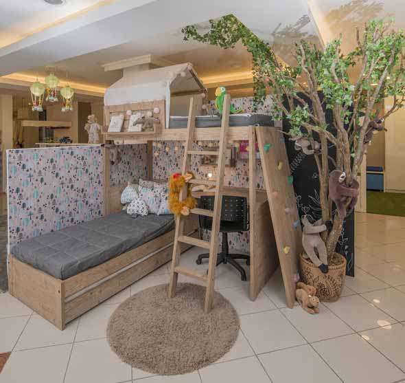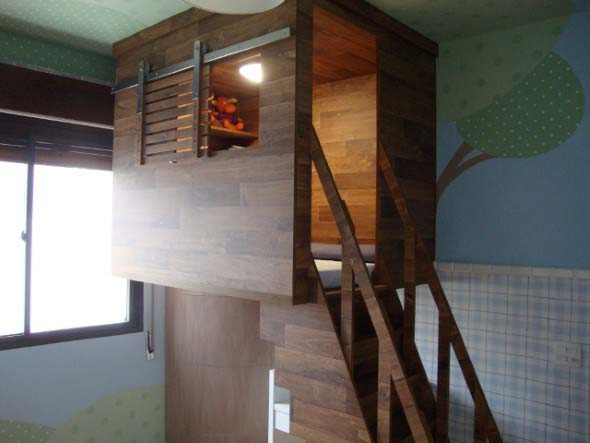 Aqui a dica principal é a personalização do quarto, que pode ser feita por uma equipe de arquitetura especializada, que vai elaborar elementos bem característicos de uma verdadeira casa na árvore aí dentro do seu lar.