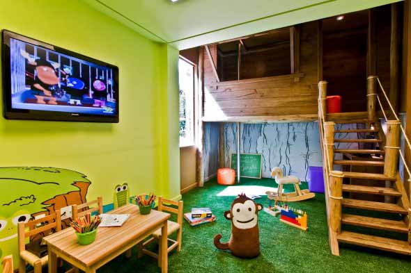 Como exemplo temos pinturas características, um dormitório em forma de cabana, escorregas, cordas, pneus, madeira aparente, e outros itens que poderiam ser vistos em uma verdadeira construção ao ar livre.