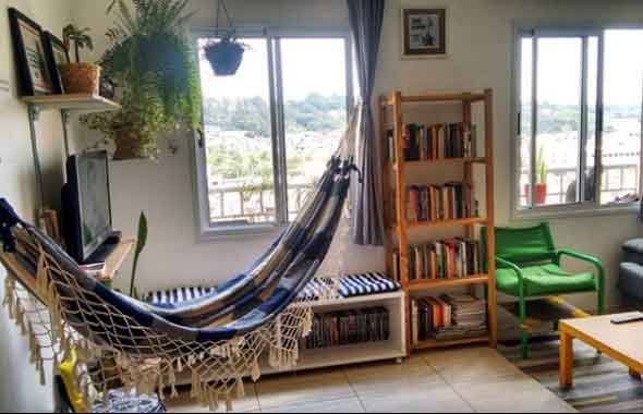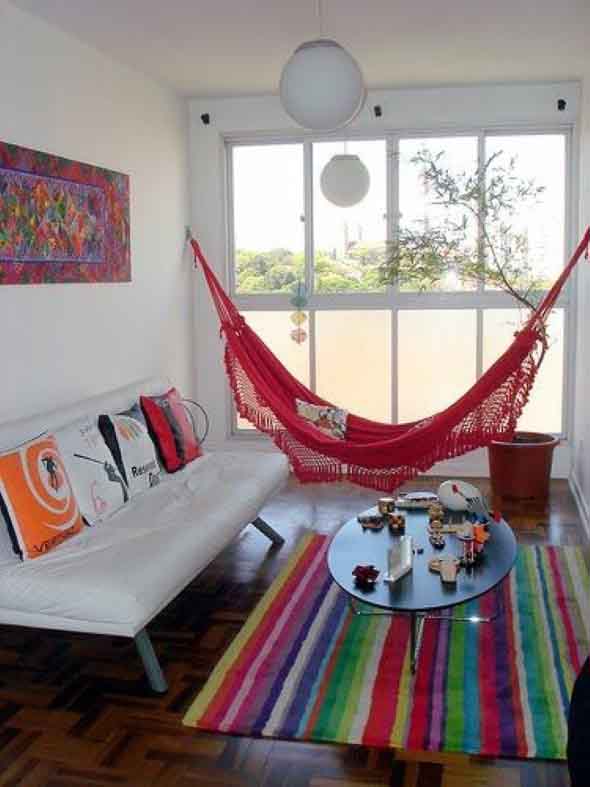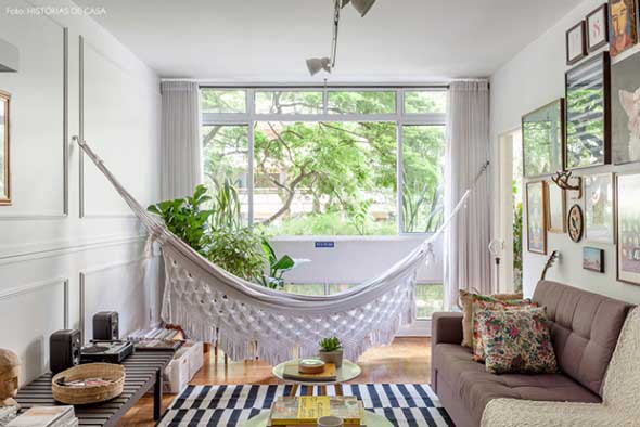 A rede na sala de estar pode ser usada como uma parte da decoração, deixada em um cantinho apenas para compor um visual despojado.