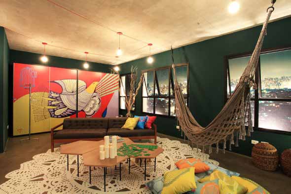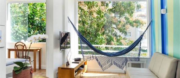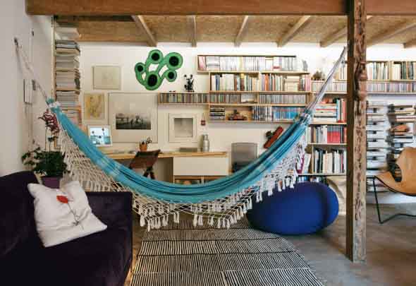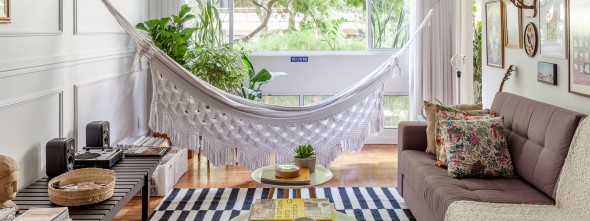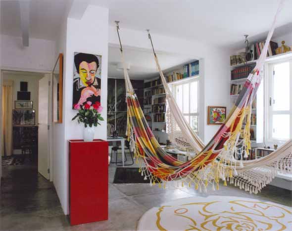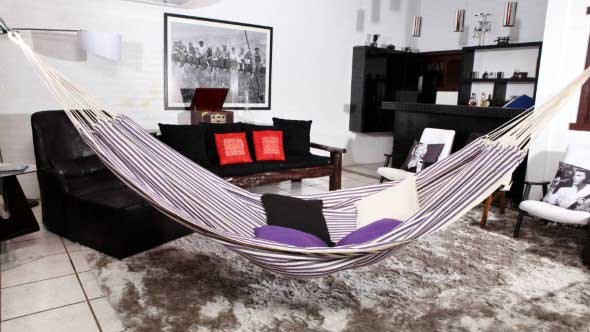 Um destes é uma rede de descanso, que comumente era usada em áreas externas da casa, mas que de uns tempos pra cá vem sendo incorporada na decoração.