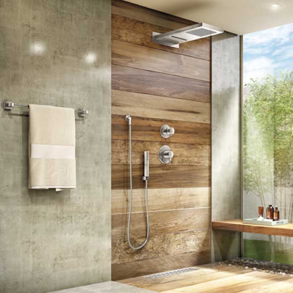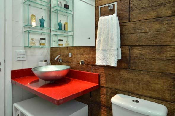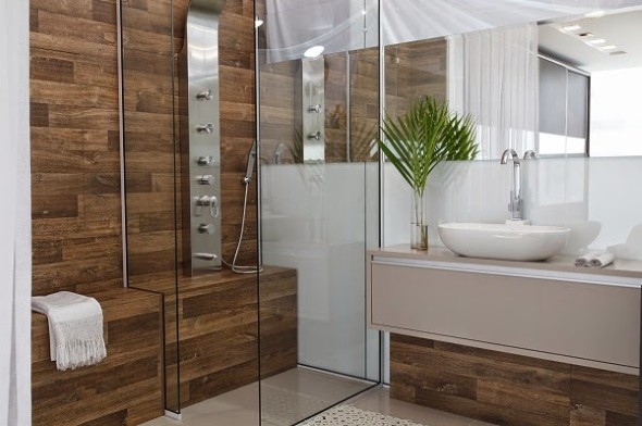 Já o banheiro se torna mais aconchegante com o revestimento amadeirado, seja ele amplo ou mais reduzido.