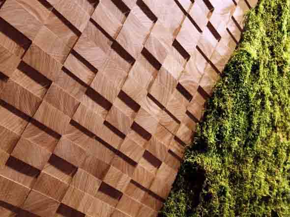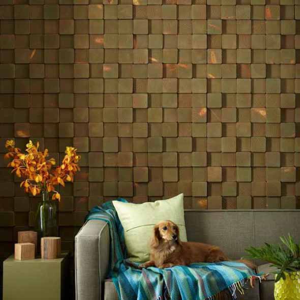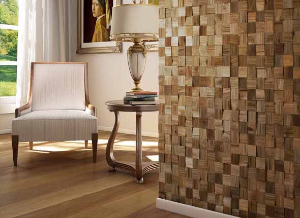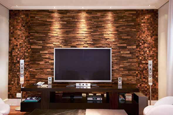 Outra boa opção são revestimentos fabricados com blocos de madeira, que fazem parte de uma linha conhecida como efeito 3D, que agrega muito mais charme e sofisticação na decoração.
