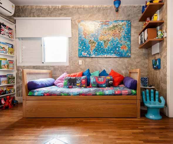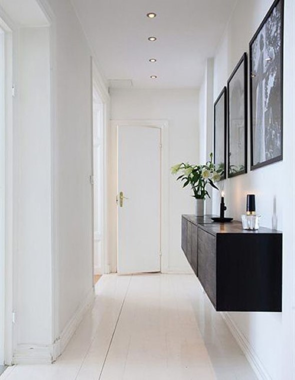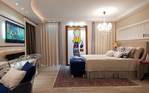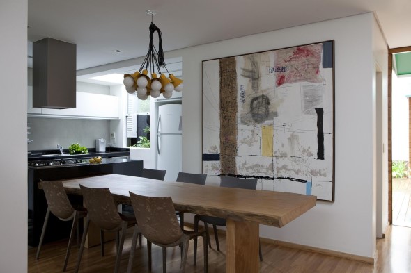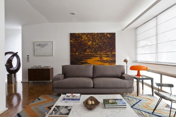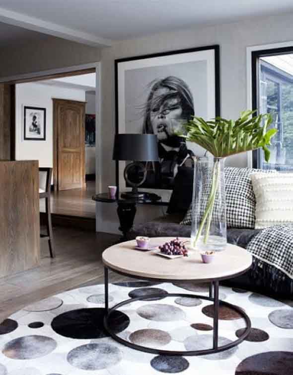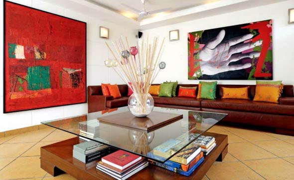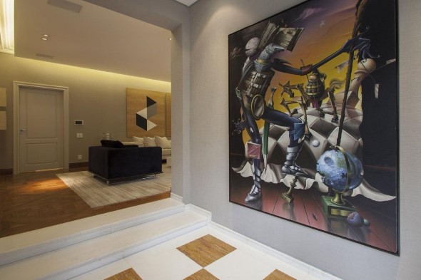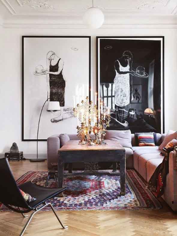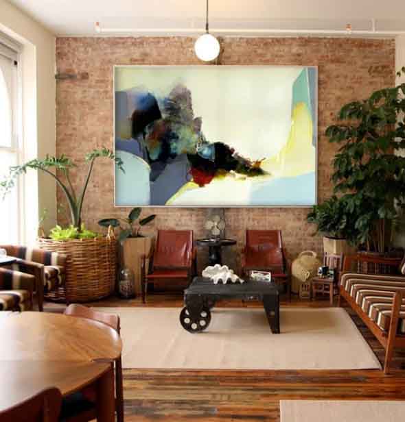 Em outros casos o quadro é tão grande que pode ser apoiado ao chão, e com isso sua posição pode ser em uma das laterais do cômodo, mas de uma forma que sua posição ganhe o destaque visual desejado.