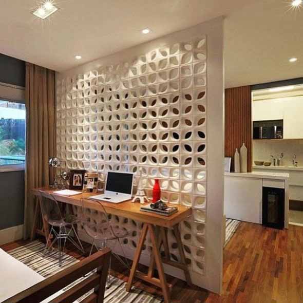 A instalação de estruturas pré-moldadas, como os painéis em madeira, acrílico ou vidro, e também os cobogós, ajudam a criar uma divisão simples entre os cômodos, mas sem impor um limite característico da parede.