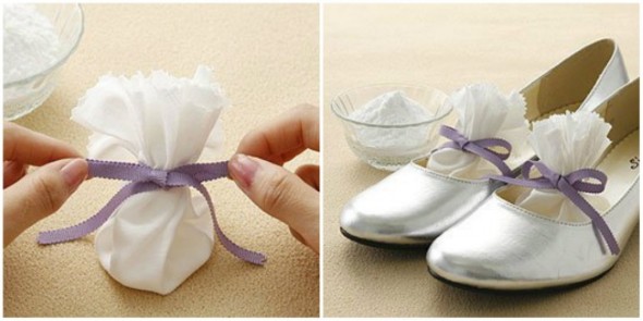 Pegue um pouco de bicarbonato de sódio e coloque em um saquinho, e depois deixe dentro dos calçados durante a noite para diminuir o odor forte. Depois retire os saquinhos, e se cair alguma partícula de bicarbonato nos calçados, remova-a, para evitar alergias nos pés.