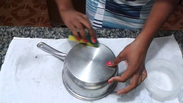 Caso a panela tenha ficado tempo demais no fogo, o bicarbonato também é um aliado para remover esta sujeira. Isso pode ser feito aplicando um pouco de pó com uma esponja umedecida em água na área manchada, e com um pouco de pressão toda sujeira vai sair. Caso seja necessário despeje um pouco de bicarbonato e água quente na panela, e deixe agir por cerca de 10 minutos, e isso vai ajudar na remoção da sujeira acumulada.