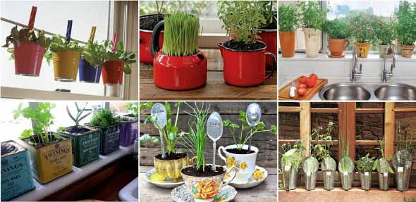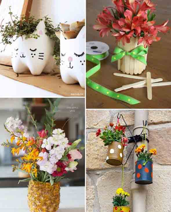 Estes vasos também podem ser feitos aí na sua casa com o uso de materiais do dia a dia, como xícaras, latinhas, bules, vidros de conserva e muito mais.