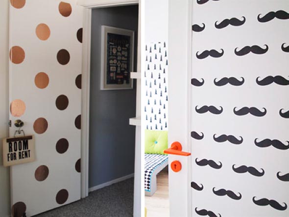 Você também pode personalizar as portas com o uso de adesivos personalizados, que podem ser feitos com papel contact, ou encontrados em lojas físicas ou na internet.