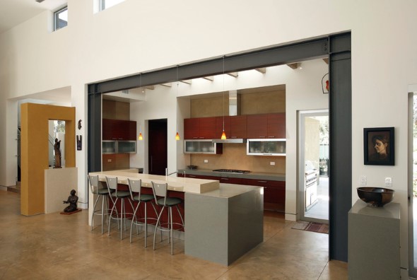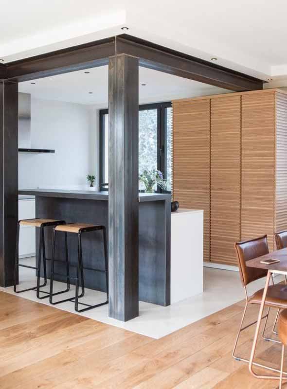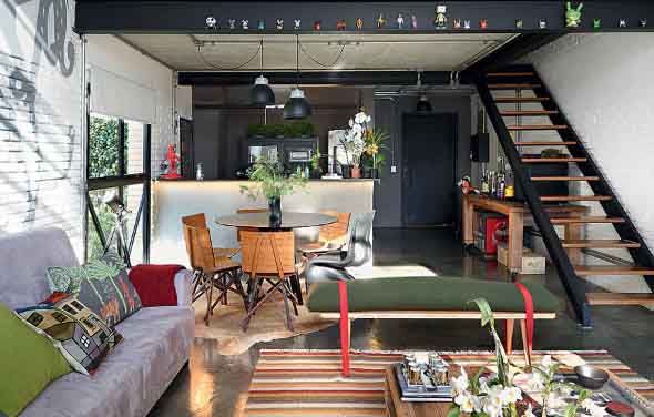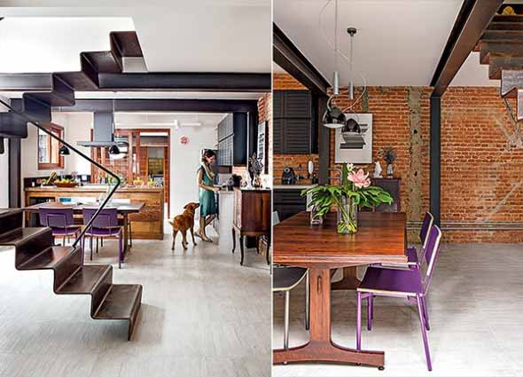 Aliado ao estilo visual, as vigas de aço aparente ajudam a criar ambientes conjugados sem paredes internas, que são divididos apenas pelo uso das vigas e colunas de aço, de uma forma discreta e totalmente incorporada na decoração.